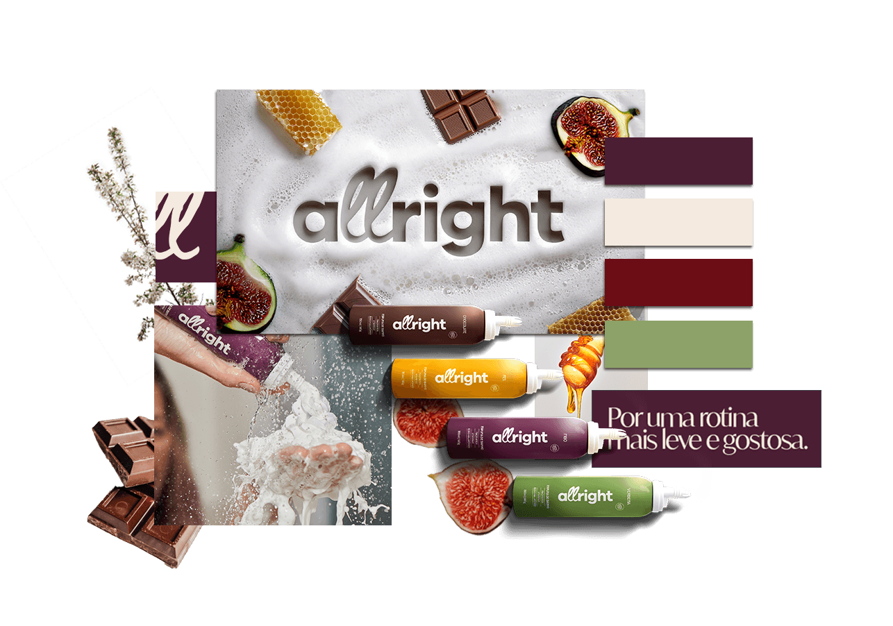 Meu trabalho com a Allright envolveu atualizar e alinhar a identidade visual, garantindo que cores, tipografia, ilustrações e aplicações refletissem essa proposta sensorial e elegante, e que todos os pontos de contato com a marca transmitissem coerência e personalidade.