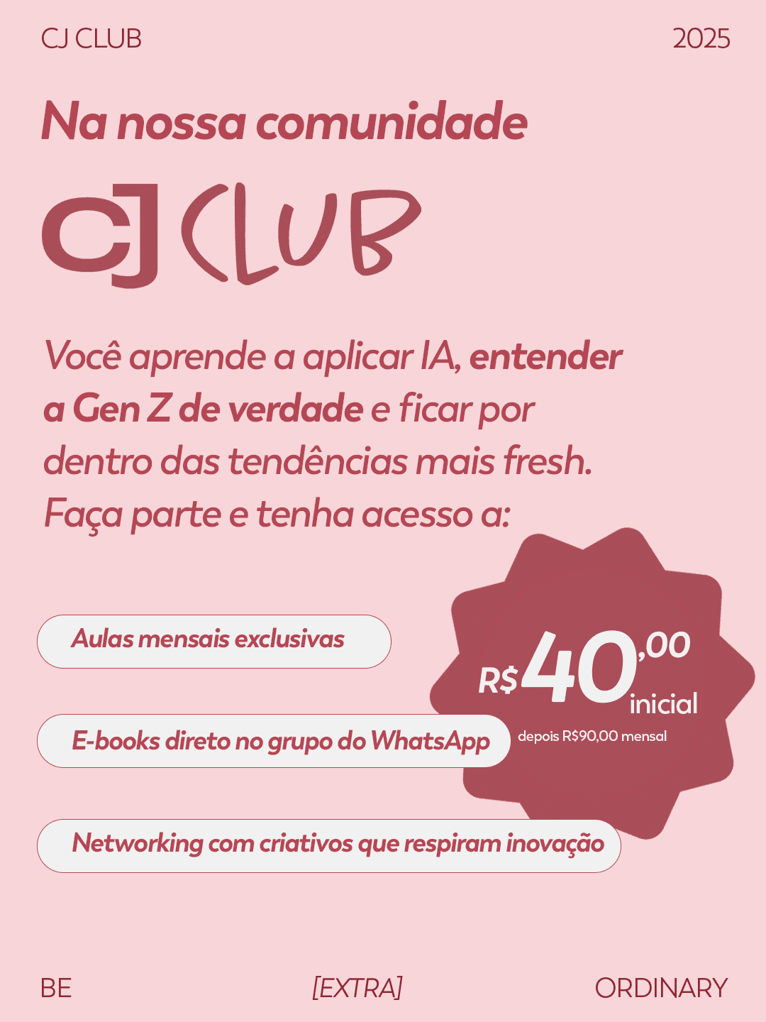 A CJHUB é uma agência de marketing as a service que acredita em unir times e potencializar talentos. Seu modelo é colaborativo, pensado para complementar as equipes internas dos clientes com um olhar estratégico e criativo. Entre seus pilares está o borogodó, o tempero especial que cada pessoa coloca no trabalho, e é isso que faz a CJ ter tanta personalidade. Também desenvolvo projetos voltados para a própria agência, traduzindo o jeito leve, curioso e cheio de energia da CJ, que conversa com o público gen z e se mantém sempre conectada às tendências.