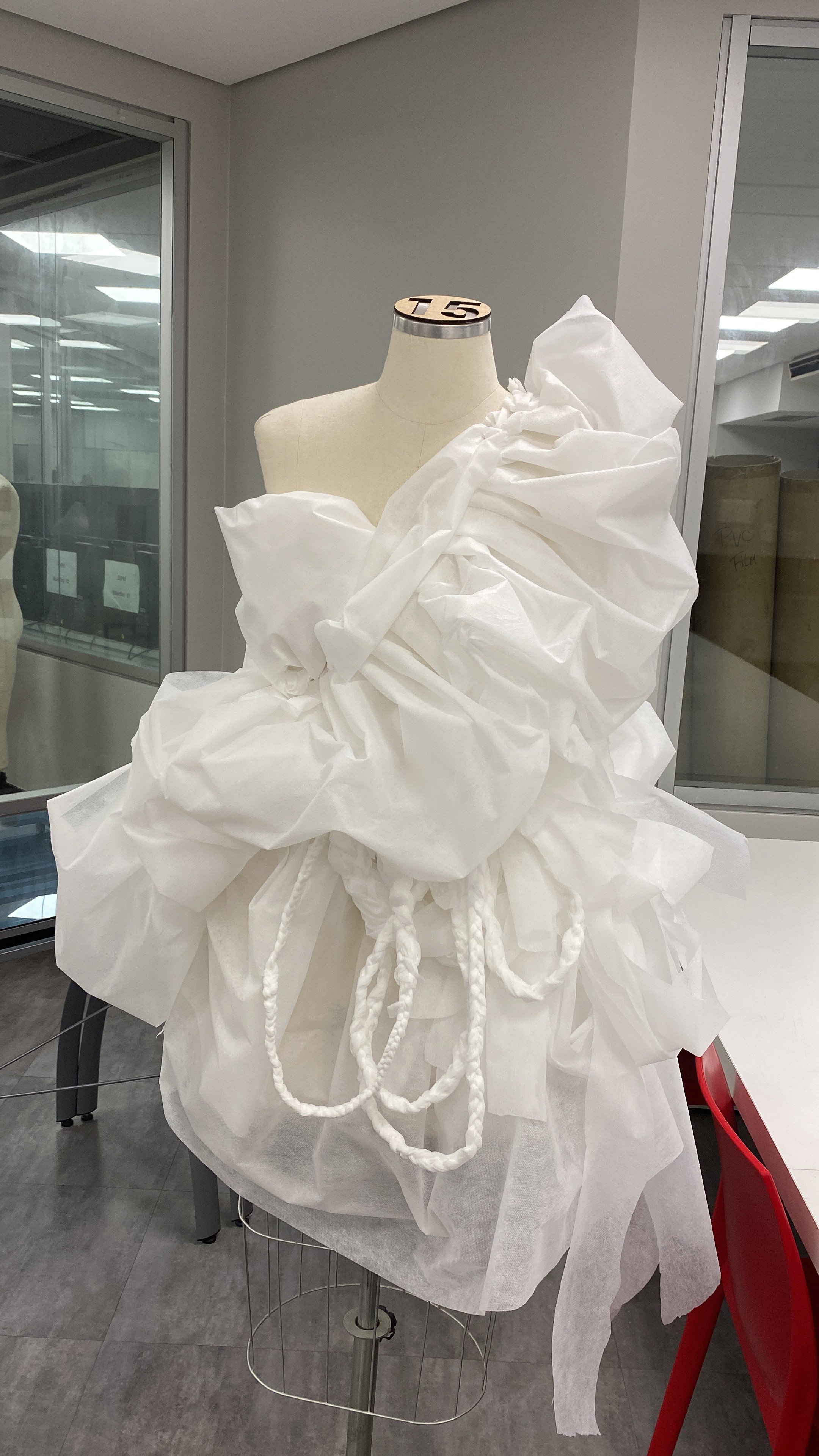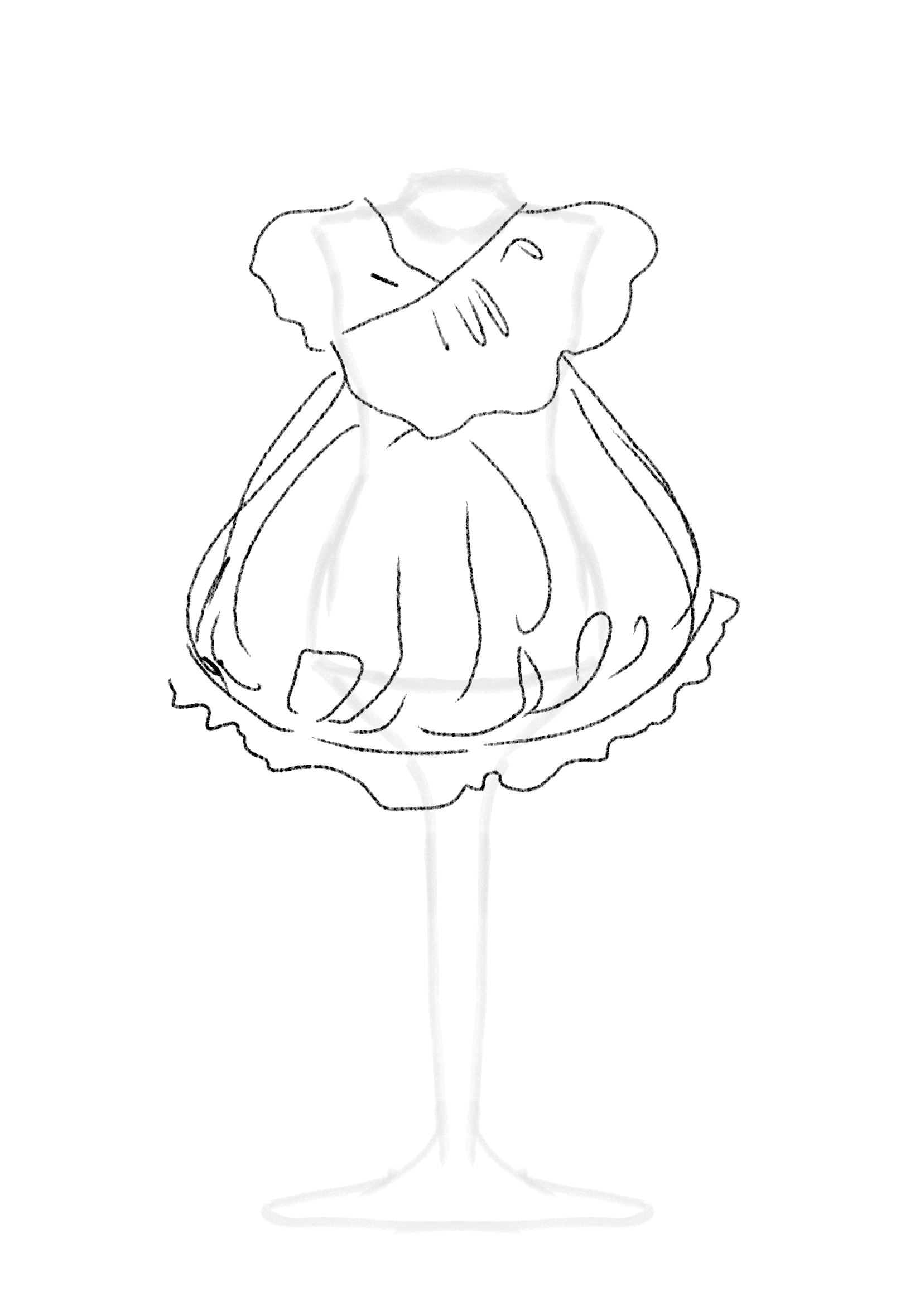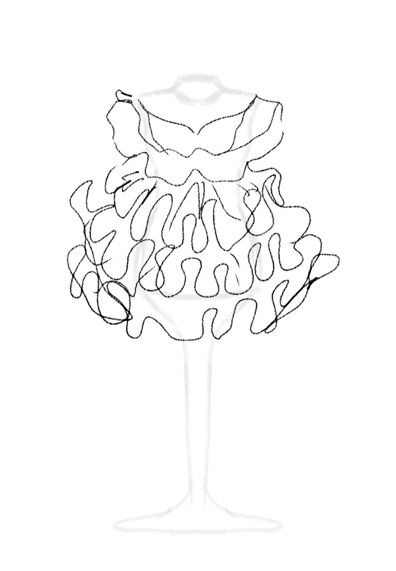 Os croquis foram criados a partir das estampas, explorando como elas se comportariam sobre o corpo. As silhuetas surgiram de testes livres de mouage, onde o tecido e o movimento orientaram o desenho. Essa fase foi guiada pela intuição: mais do que seguir moldes, o processo buscou descobrir novas formas de construção.