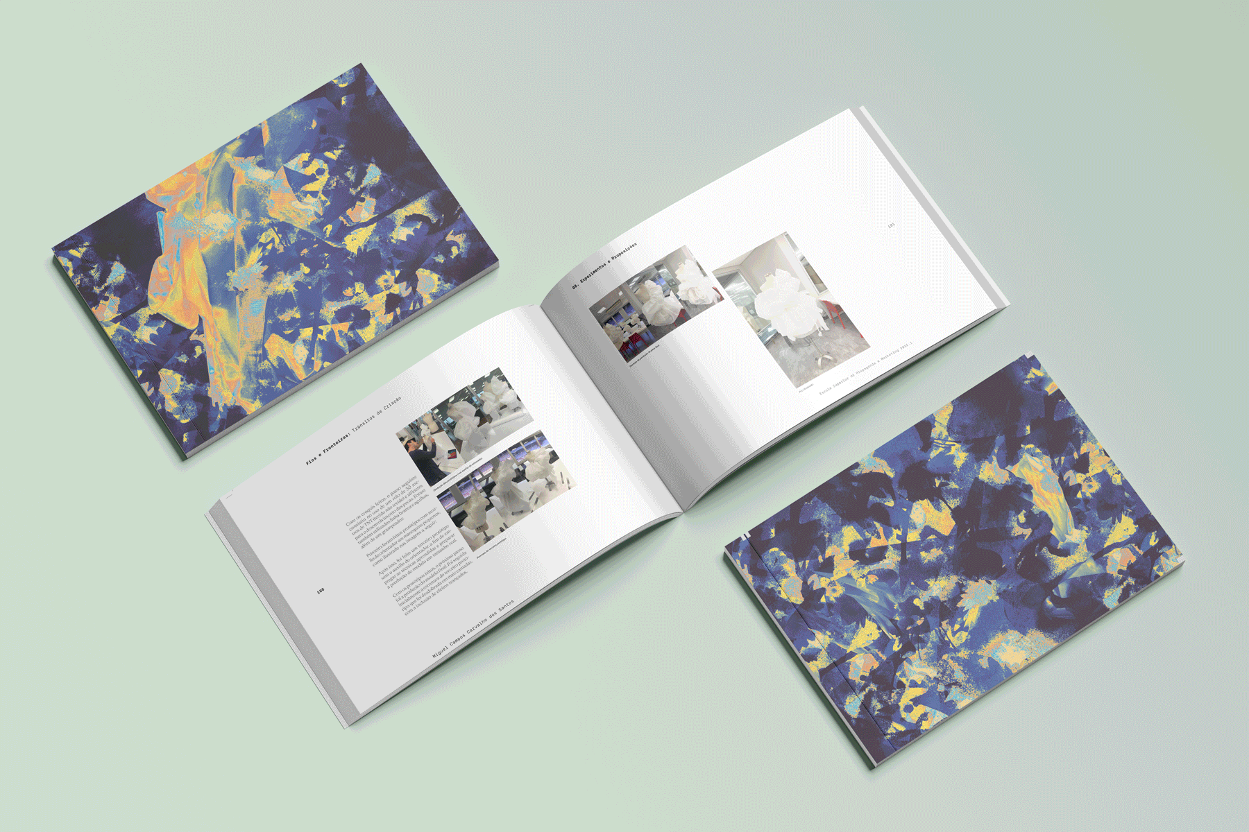 Além da coleção de estampas e da experimentação têxtil, Fios e Fronteiras também se desdobrou em uma monografia física, com projeto gráfico, logo e identidade visual próprios. O livro reúne os conceitos, processos e referências do projeto em uma narrativa visual que reflete o mesmo equilíbrio entre sensibilidade e estrutura presente nas criações.A capa e a contracapa foram pensadas como extensões das estampas, explorando a textura e a cor como linguagem. As páginas internas trazem composições que alternam texto, imagem e espaço em branco, criando ritmo e respiro.