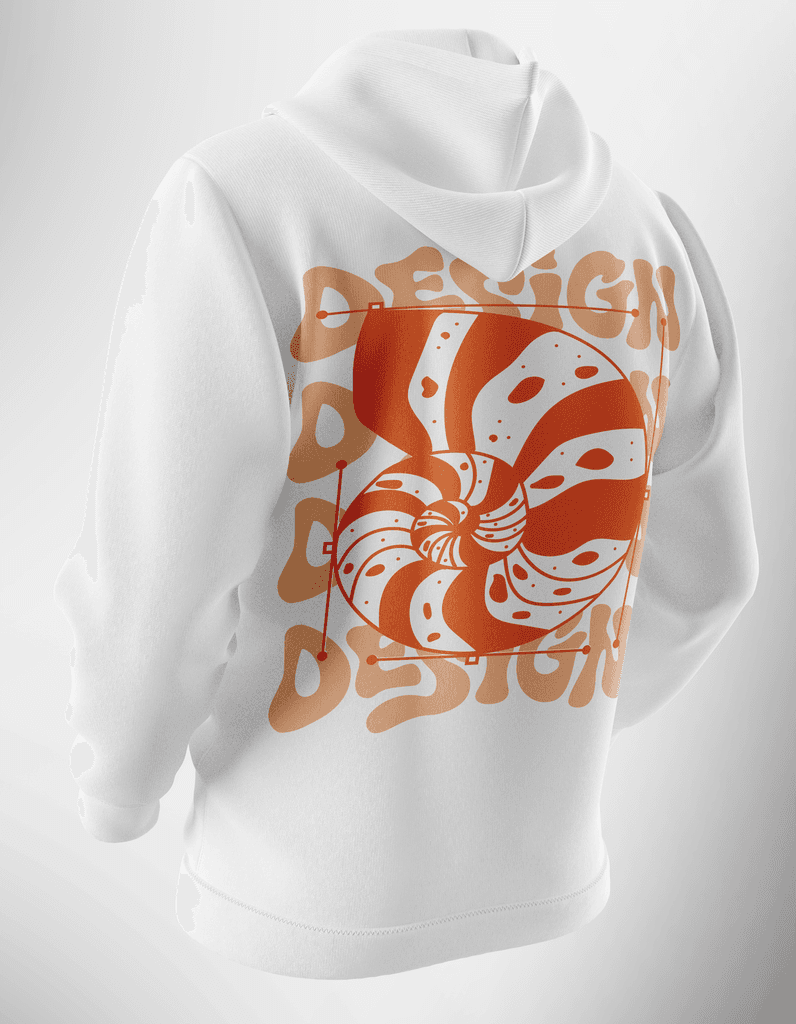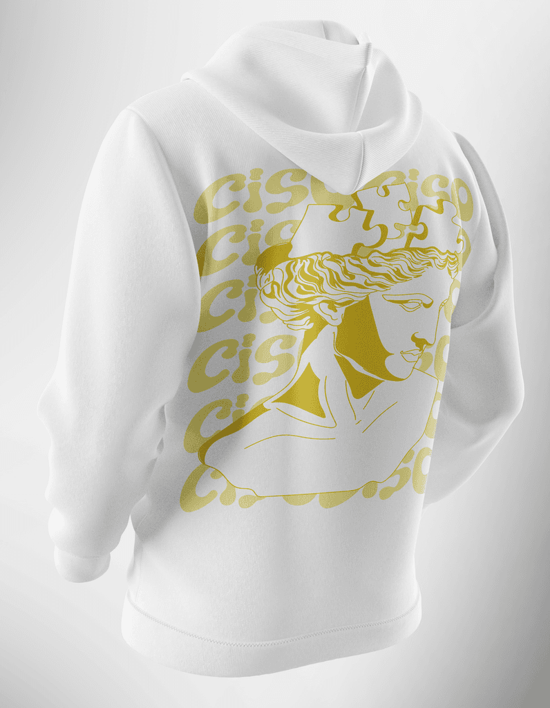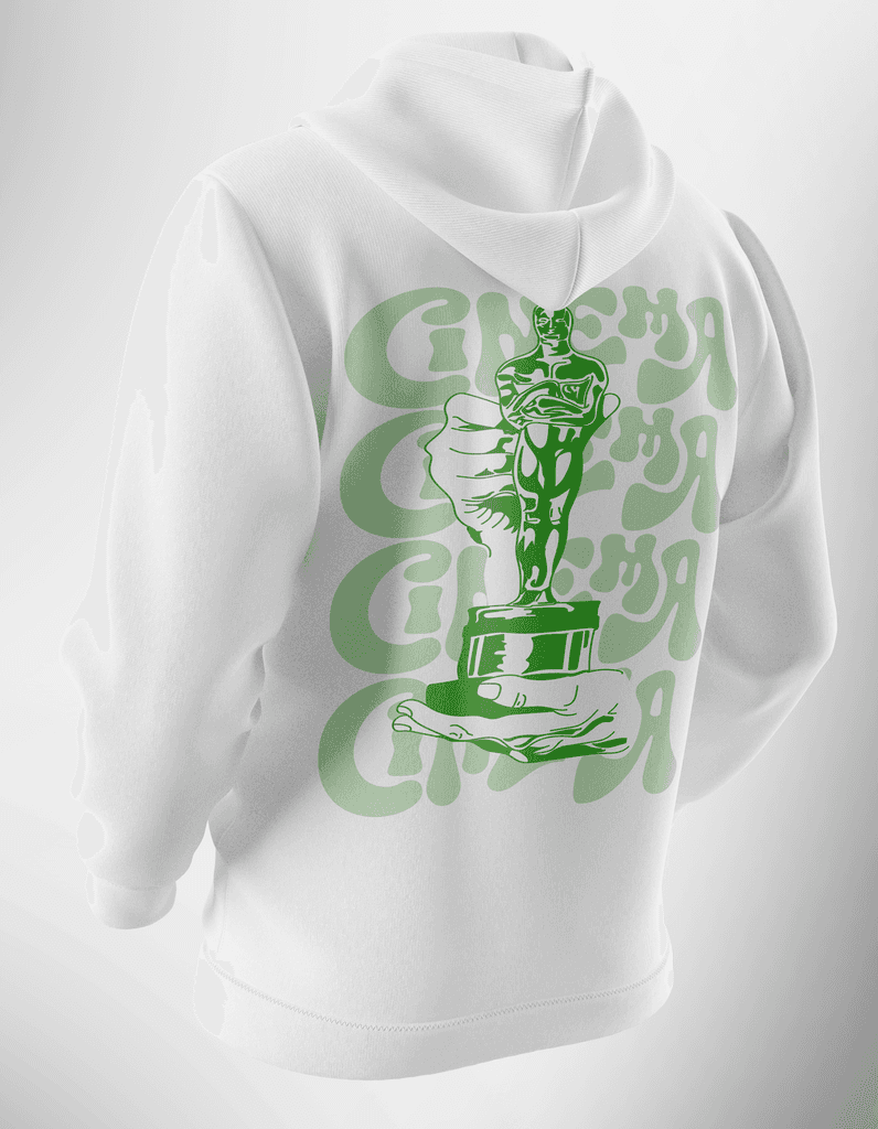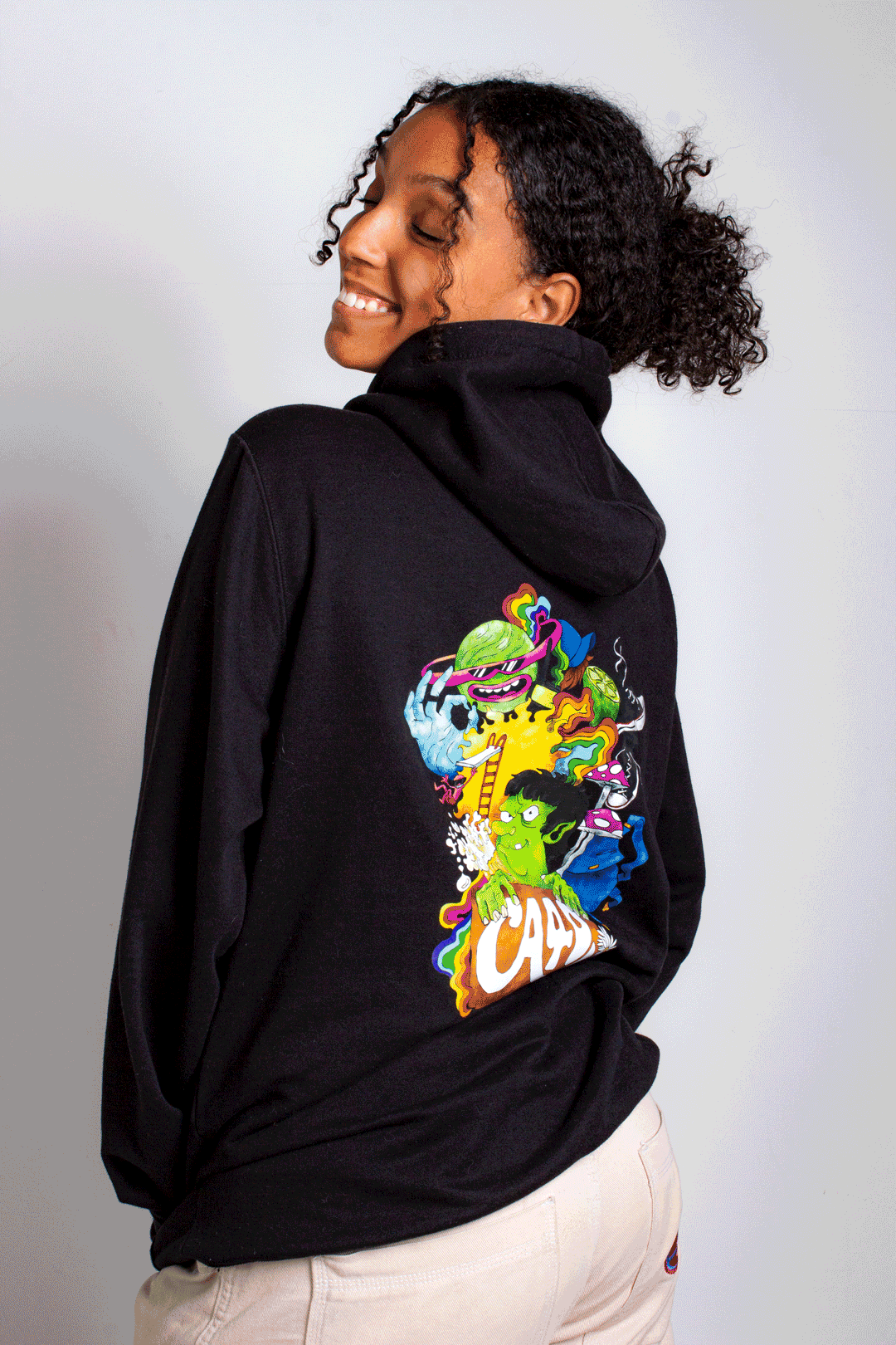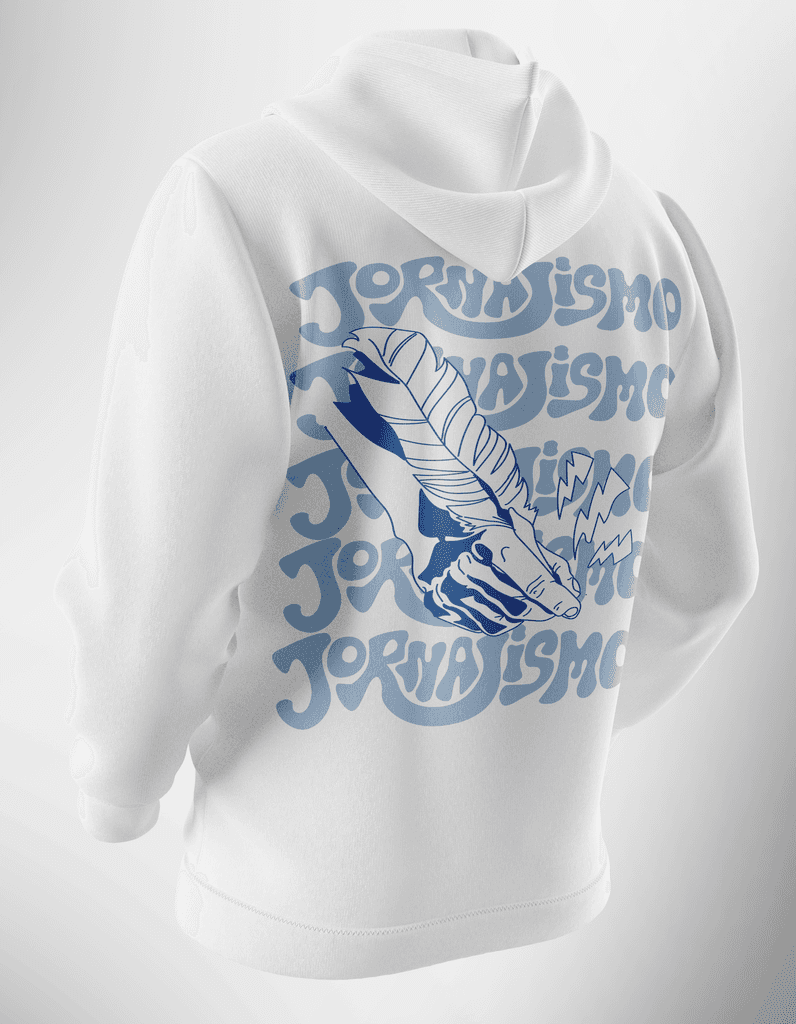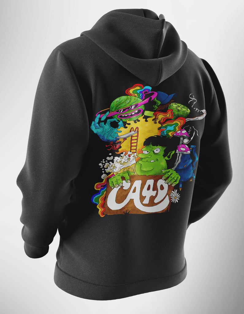 As estampas dos moletons foram criadas com símbolos representativos de cada curso. Para comemorar os 30 anos do CA4D, criei uma estampa especial com o mascote Ogro Rubens, inserido em elementos psicodélicos. A arte se destaca das demais, reforçando o caráter comemorativo da coleção.