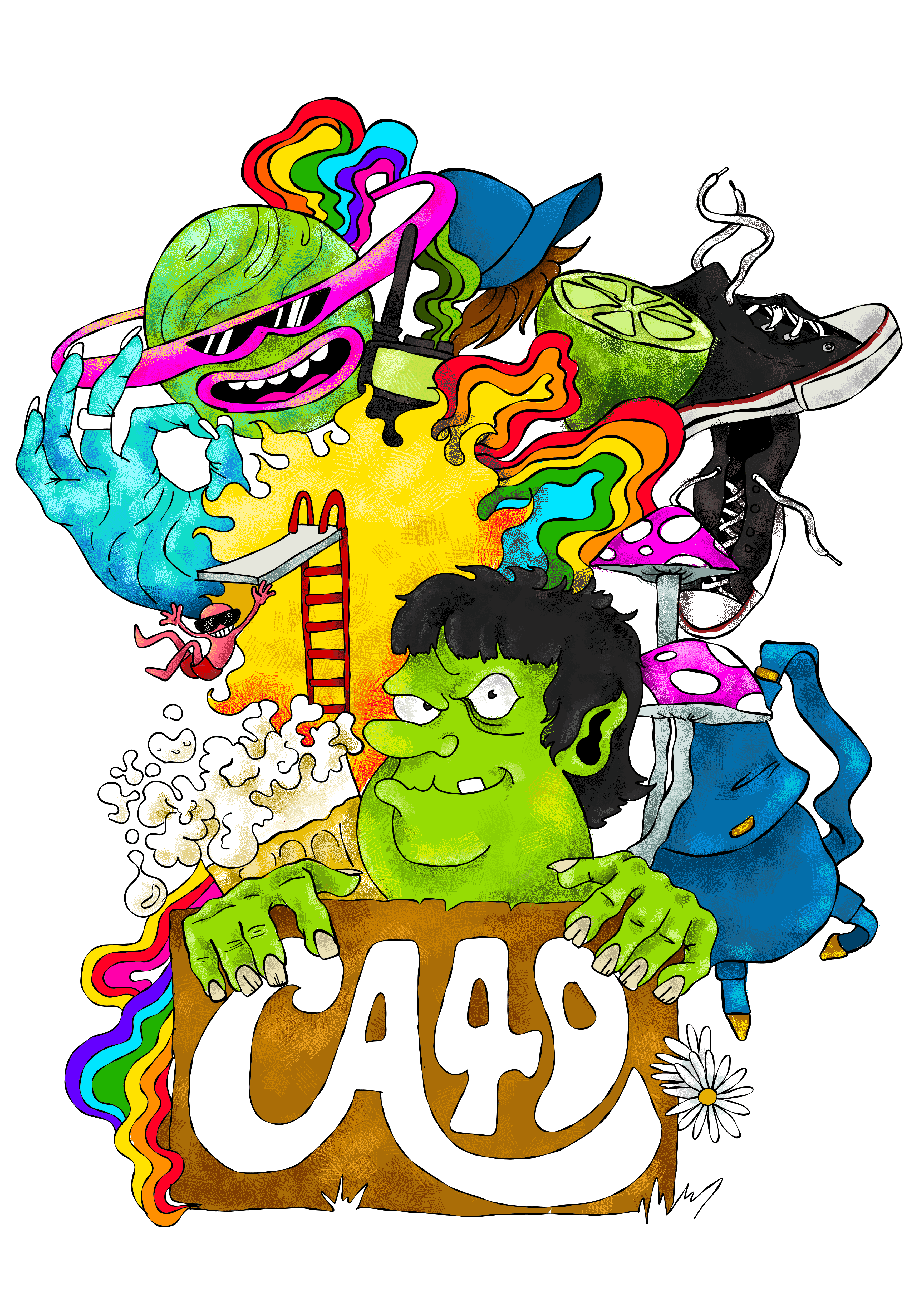 A edição de 2023 também acompanhou a comemoração de 30 anos do Centro acadêmico 4 de dezembro. Para isso, desenvolvi uma estampa exclusiva com o protagonismo do mascote do CA4D: o Ogro Rubens. Com a intenção de acompanhar os estilos usados como referência, mas também de se diferenciar das demais estampas, a ilustração conta com muitas cores, movimento e elementos do psicodelismo, reforçando o caráter despojado da coleção.