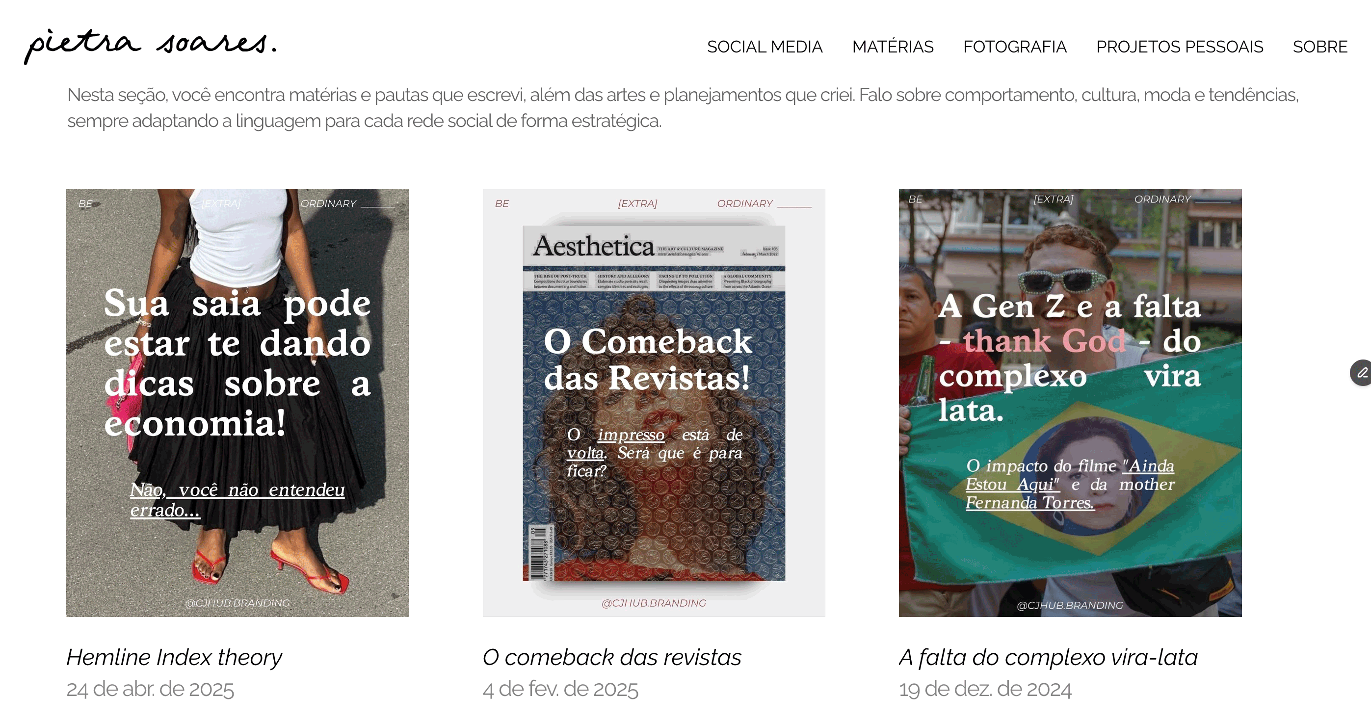 Pietra é uma profissional multifacetada e trabalha também com textos para diferentes redes sociais. Para demonstrar isso, optei pelo uso do recurso de CMS, a fim de facilitar a entrada de novos projetos na plataforma. Além disso, em cada página do blog, acrescentei filtros, para expor as adaptações feitas por Pietra de acordo com a rede social em que seus textos foram publicados e, no caso do instagram e do TikTok, fiz também uma simulação de interface para deixar a página mais interessante.