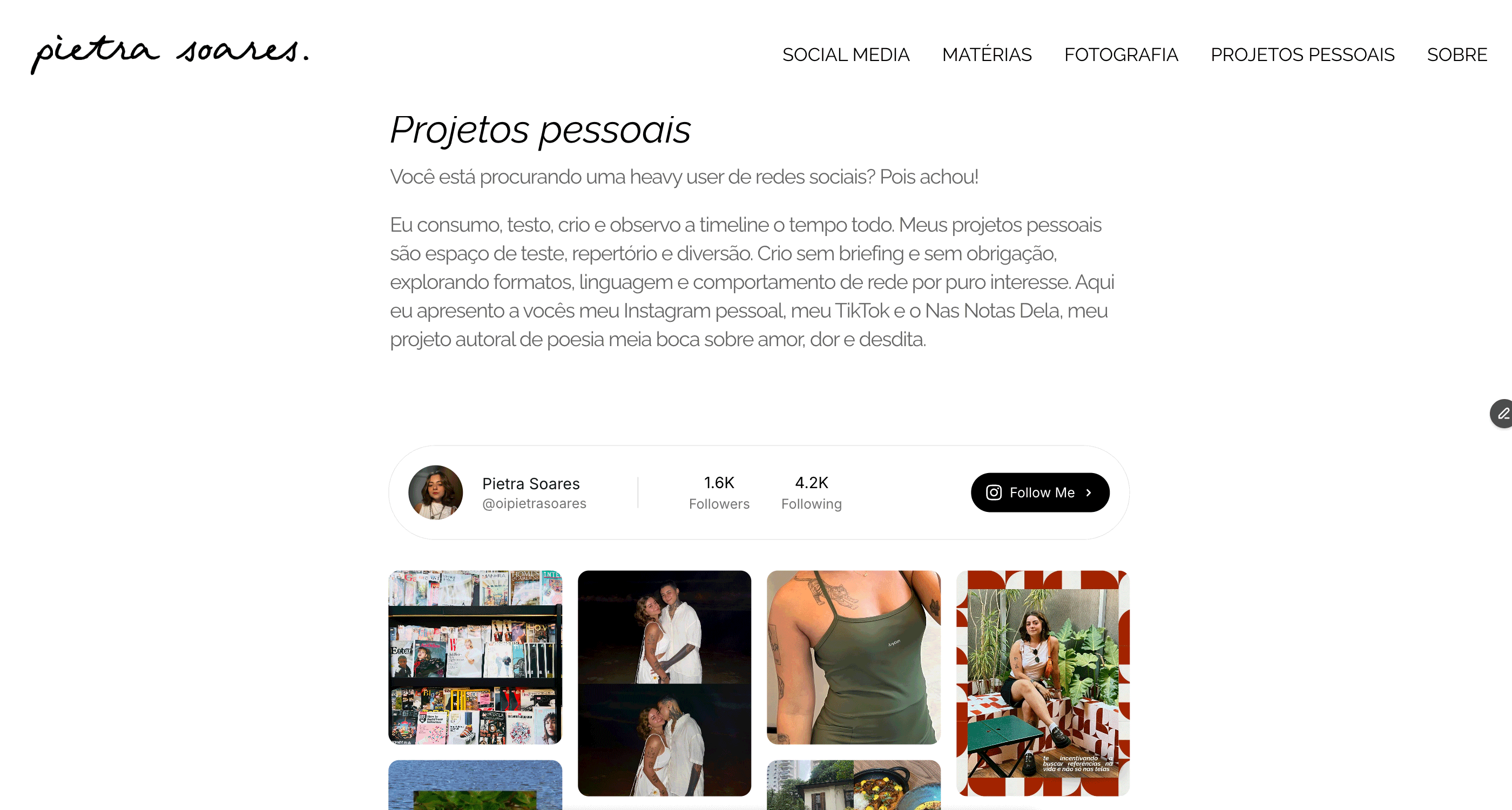Para a página de projetos pessoais, Pietra buscava expor sua presença em redes sociais. Para isso, optei por utilizar de códigos de embed para trazer a interface das plataformas para dentro do site.
