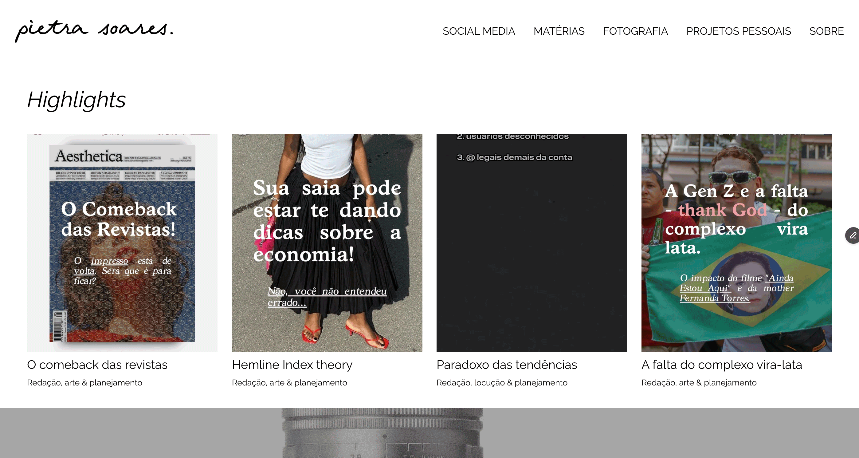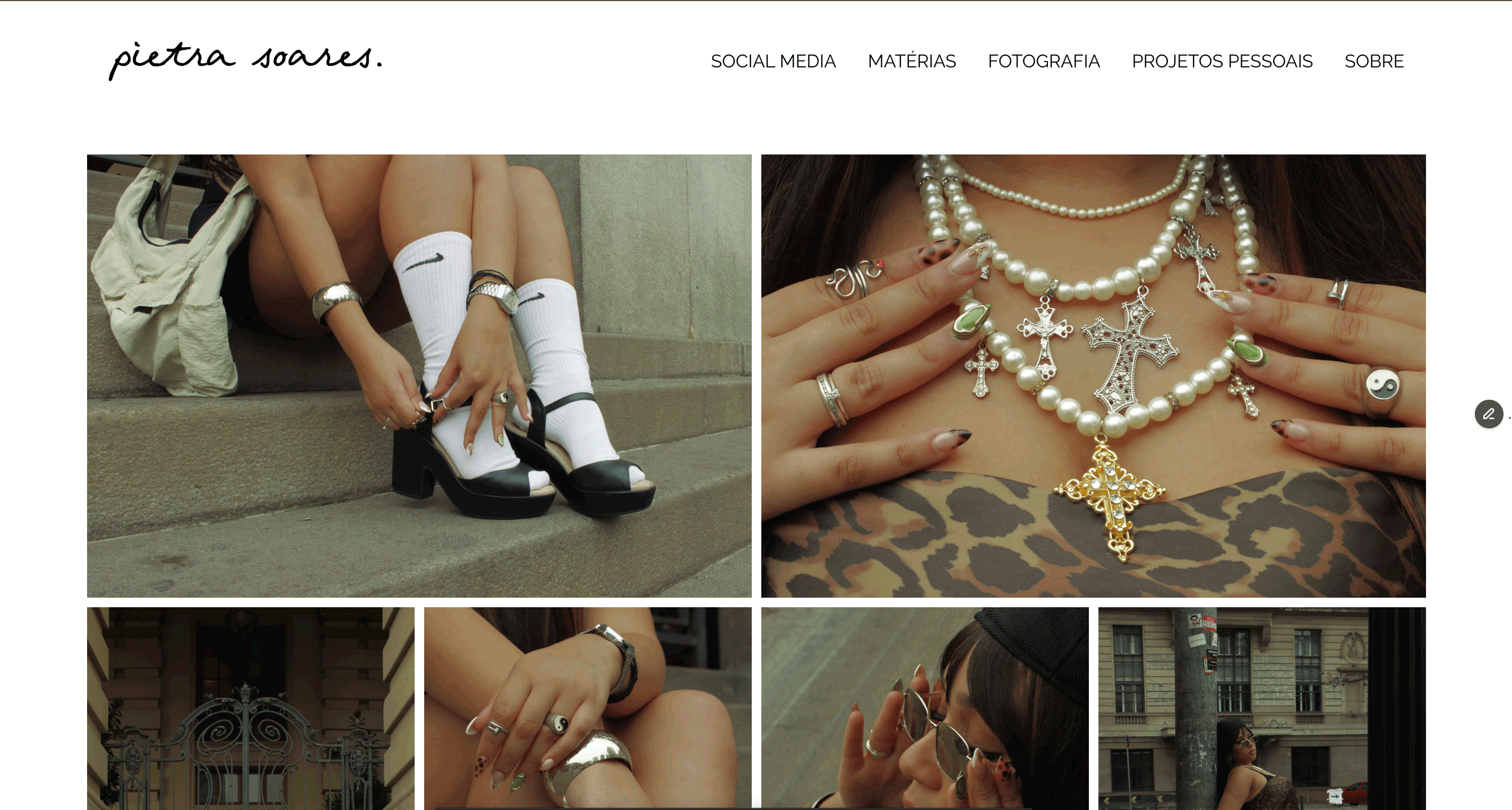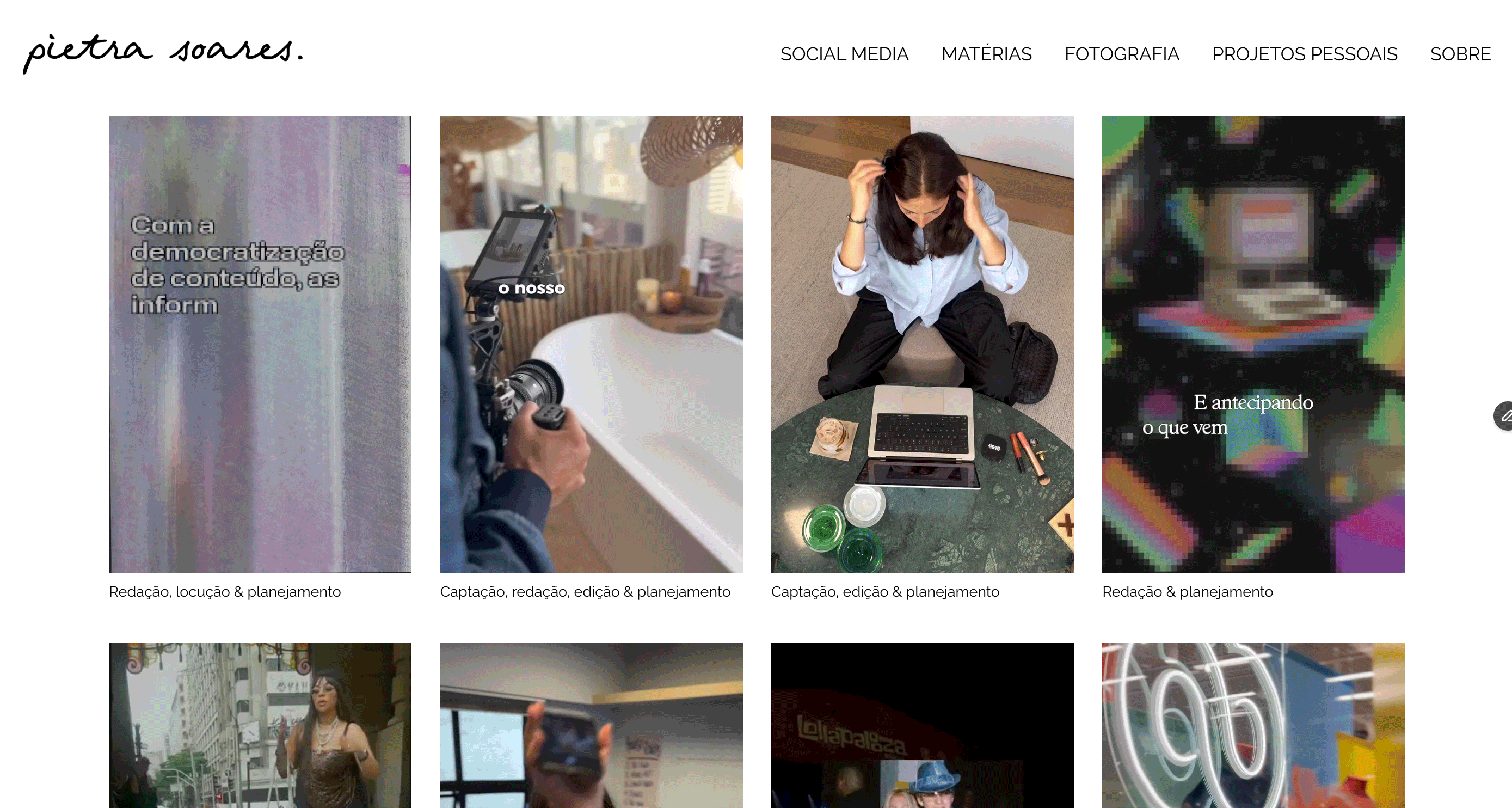 Na home do site, encontram-se logo no começo os projetos em destaque, seguidos de banners dinâmicos em carrossel indicando as principais páginas do site e o currículo da Pietra abaixo.
