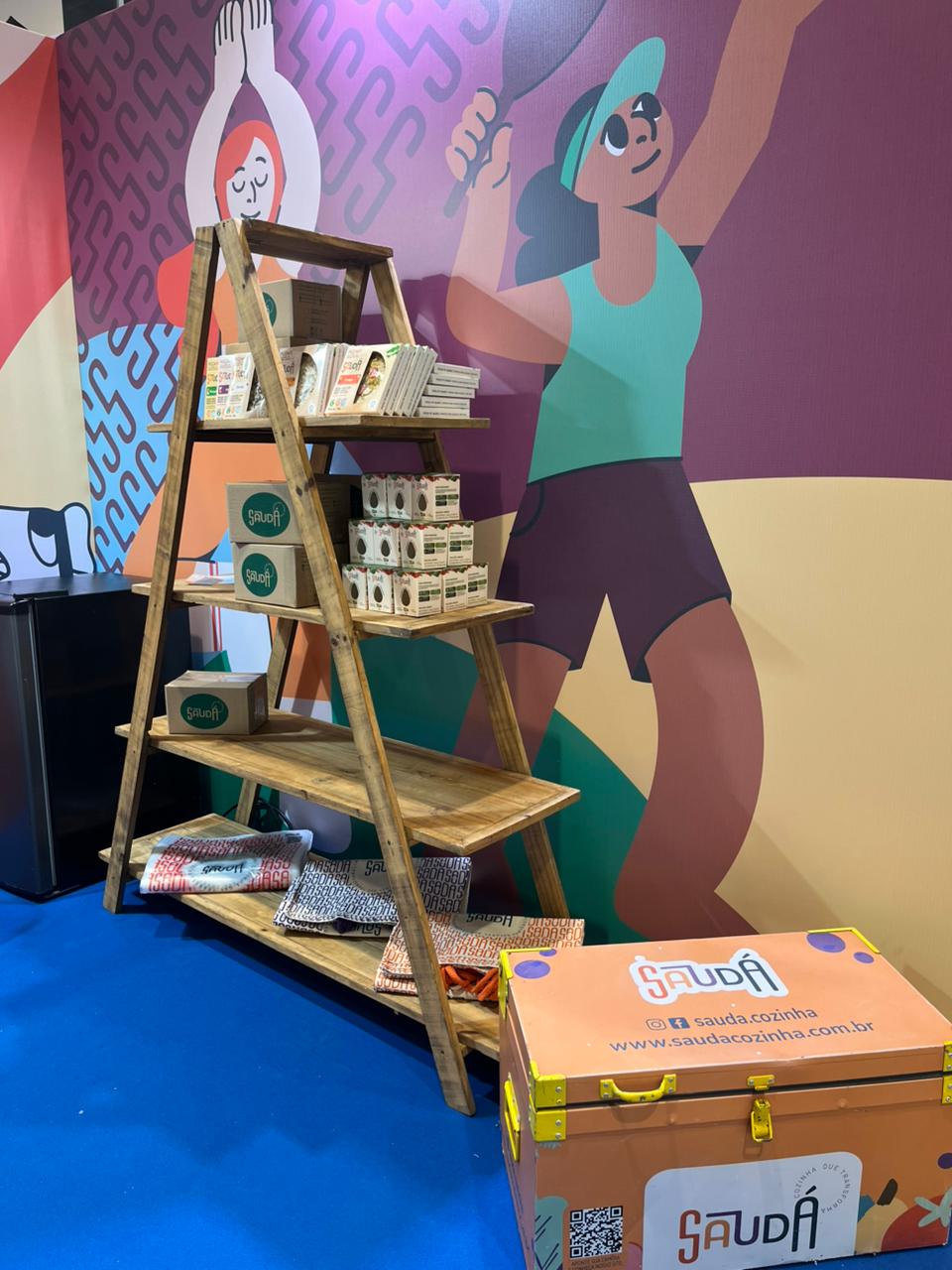 Para o stand da Saudá em um evento, criei o design das paredes, balcão e placas, integrando as ilustrações de forma envolvente. A ideia era transformar o espaço em uma experiência de marca um ambiente que transmitisse o frescor, a cor e a alegria dos produtos. O stand virou um ponto de encontro vibrante e convidativo, onde cada detalhe reforçava a presença visual e emocional da Saudá.